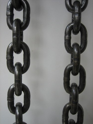 所謂錳鋼起重鏈條截斷,就是截取數量相同的內連接和外連接,減少錳鋼起重鏈條的節數,縮短錳鋼起重鏈條。通常是截取與連接鏈節相連的一個內連接及與這個內鏈節相連的那個外鏈接,錳鋼起重鏈條截短的方法是:將錳鋼起重鏈條平放在鐵氈上,下面墊上個合適的襯套或螺母,使要截取的那一鏈節的銷軸下端對準襯套或螺母空,用榔頭垂擊銷軸上端面,使其和外鏈板平位置,然后,用平頭蟲子將銷軸沖出來。